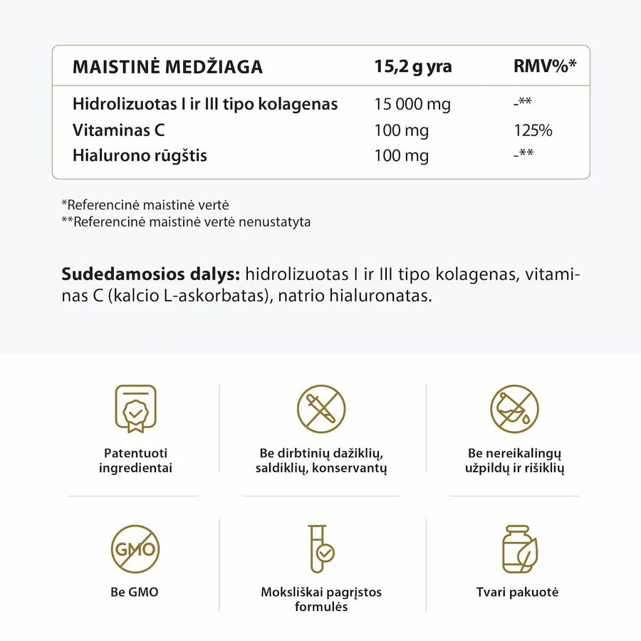 • Didelė kolageno koncentracija – net 15 000 mg I ir III tipo hidrolizuoto kolageno vienoje porcijoje odos, plaukų, nagų ir sąnarių palaikymui;
