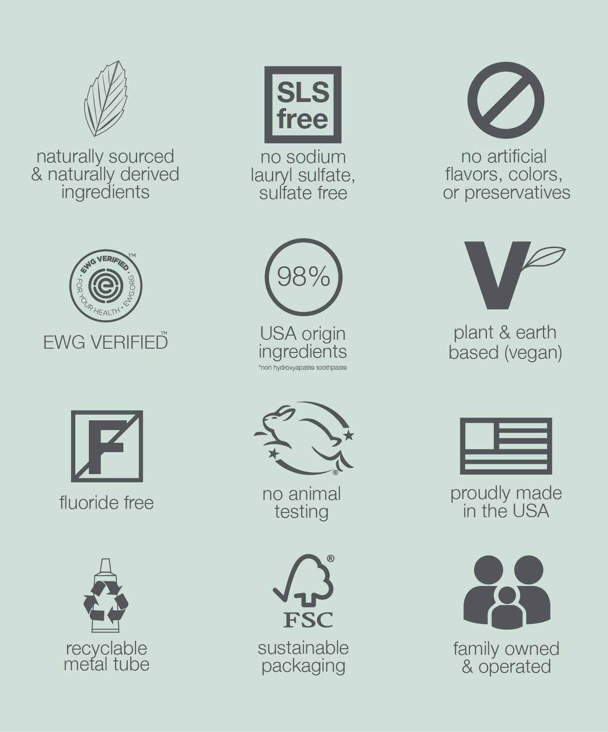 Sudėtis: calcium carbonate (limestone abrasive), purified water, sodium bicarbonate (baking soda), vegetable glycerin, hydrated silica, xylitol (birch derived), sodium cocoyl glutamate (coconut derived), carrageenan (seaweed derived), mentha piperita (peppermint oil), mentha viridis (spearmint) leaf oil, pimpinella anisum (anise) seed extract, gaultheria procumbens (wintergreen) leaf oil, stevia (leaf extract).
