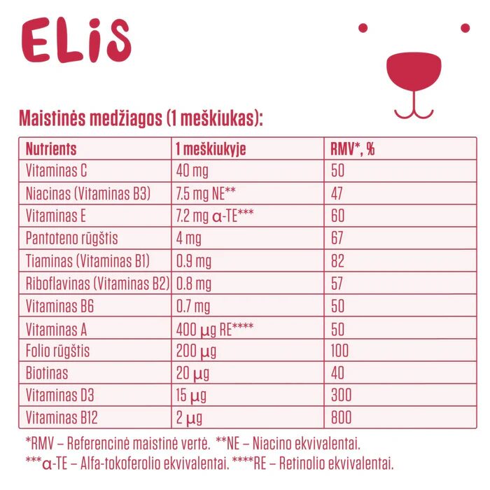 ELIS vitaminų sudėtyje – 12 svarbiausių vitaminų ir mineralų, padedančių stiprinti imuninę sistemą, palaikyti energijos lygį, skatinti kaulų ir dantų augimą, puoselėti odos, plaukų ir regėjimo sveikatą bei palaikyti normalią psichinę funkciją. Specialiai subalansuotas multivitaminų kompleksas augantiems vaikams apima vitaminus C, D3, A, E, visą B grupę (B1, B2, B3, B5, B6, B12), folio rūgštį ir biotiną.