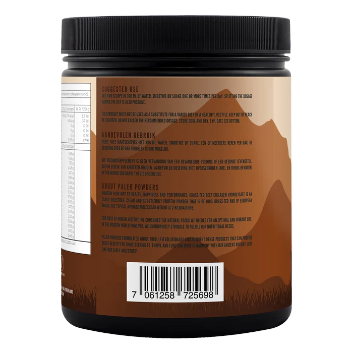 Paleo Powders Hydrolysate Grass feed hidrolizuotas kolagenas pagamintas iš labai aukštos kokybės jautienos maistingų kaulų. Skonis ir kvapas labai neutralus, todėl puikiai tinka ir gaminant kokteilius, vartojimui su maistu. Dėl mažos molekulinės masės (3–6 kDa) kolageno peptidai įsisavinami itin efektyviai ir greitai.