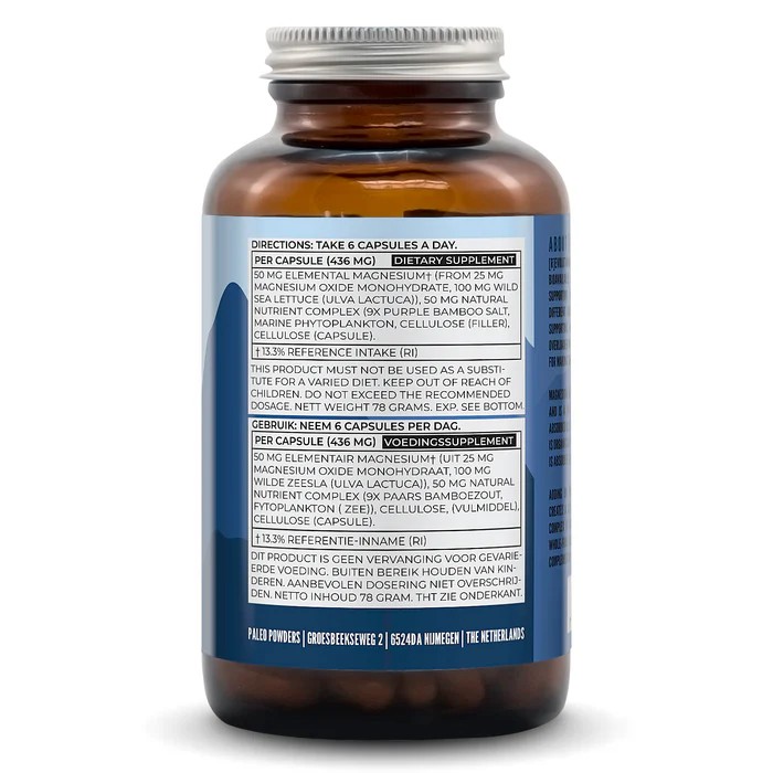 Sudėtis: Vienoje kapsulėje yra: 50 mg elementinio magnio – sudarytas iš 25 mg magnio oksido monohidrato, 100 mg laukinių jūros salotų (Ulva Lactuca), 50 mg natūralių maistinių medžiagų komplekso, (9x purpurinė bambuko druska, fitoplanktonas (jūrinis)