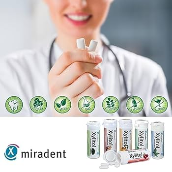 Miradent Xylitol vyšnių skonio ksilitolio pastilės, 1 dėžutė (26 pastilės).